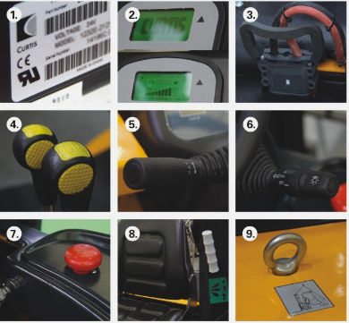 1.美国CURTIS控制器 2.CURTIS仪表盘,带低电压保护 3.德国REMA充电插件 4.操纵杆控制货叉起升下降,门架前倾后仰 5.简单的前进后退档 6.仿汽车用车灯转向杆 7.紧急情况下可按下红色断电开关,切断所有电源,车子立即停止 8.座椅可根据操作者体重调节 1.CURTIS controller from America 2.CURTIS dashboard, have the function of low battery shut down 3.REMA plug from Germany 4.The levers control lifting of forks and tilt of mast 5.Simple forward and reverse gears 6.Light turning control bar like car 7.Press the red button in an emergency, cut down all the power, stop the truck 8.Adjustable seat according to the operator |