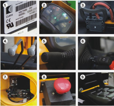 1.美国CURTIS控制器 2.仪表盘,工作状态一目了然 3.德国REMA充电插件 4.操纵杆控制货叉起升下降,门架前倾后仰 5.简单的前进后退档 6.仿汽车用车灯转向杆 7.拆装维护简单,打开后盖即可看到电器系统 8.紧急情况下可按下红色断电开关,切断所有电源,车子立即停止 1.CURTIS controller from America 2.Dashboard, display work conditions clearly 3.REMA plug from Germany 4.The levers control lifting of forks and tilt of mast 5.Simple forward and reverse gears 6.Light turning control bar like car 7.Easy maintenance, open the cover to check electric system 8.Press the red button in an emergency, cut down all the power, stop the truck Adjustable seat according to the operator |