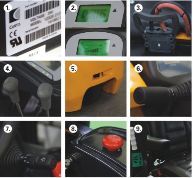 1.美国CURTIS控制器 2.CURTIS仪表盘,带低电压保护 3.德国REMA充电插件 4.操纵杆控制货叉起升下降,门架前倾后仰 5.三支点后轮驱动,转弯半径小 6.简单的前进后退档 7.仿汽车用车灯转向杆 8.紧急情况下可按下红色断电开关,切断所有电源,车子立即停止 1.CURTIS controller from America 2.CURTIS dashboard, have the function of low battery shut down 3.REMA plug from Germany 4.The levers control lifting of forks and tilt of mast 5.3-wheel forklift, have smaller turning radius 6.Simple forward and reverse gears 7.Light turning control bar like car 8.Press the red button in an emergency, cut down all the power, stop the truck |