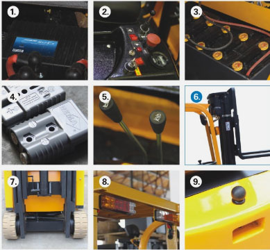 1.美国CURTIS控制器 2.CURTIS电量表,带低电压保护 3.385Ah大容量蓄电池 4.德国REMA充电插件 5.操纵杆控制货叉起升下降,门架前倾后仰 6.带自由提升,货叉起升时门架不起升 7.实心无痕橡胶轮胎,保护地面 8.三种颜色后灯,分别为制动、倒车、转向警示灯 1.CURTIS controller from America 2.CURTIS coulombmeter, have the function of low battery shut down 3.385Ah large capacity battery 4.REMA plug from Germany 5.The levers control lifting of forks and tilt of mast 6.With free lifting height, when forks raising, mst is still 7.Solid traceless tyres, protect the floor 8.Three different colours, means brake, reverse and turning |