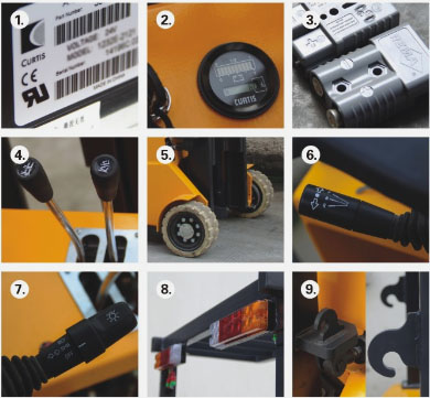 1.美国CURTIS控制器 2.CURTIS电量表,带低电压保护 3.德国REMA充电插件 4.操纵杆控制货叉起升下降,门架前倾后仰 5.实心无痕橡胶轮胎,保护地面 6.简单的前进后退档 7.仿汽车用车灯转向杆 8.三种颜色后灯,分别为制动、倒车、转向警示灯 1.CURTIS controller from America 2.CURTIS coulombmeter, have the function of low battery shut down 3.REMA plug from Germany 4.The levers control lifting of forks and tilt of mast 5.Solid traceless tyres, protect the floor 6.Simple forward and reverse gears 7.Light turning control bar like car 8.Three different colours, means brake, reverse and turning |