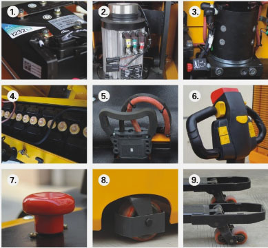 1.美国CURTIS交流控制器 2.立式交流驱动,维护方便 3.WINNER液压泵站 4.240Ah大容量蓄电池 5.德国REMA充电插件 6.紧急反向行驶功能,按下此按钮,车子可反向行驶 7.紧急情况下可按下红色断电开关,切断所有电源,车子立即停止 8.平衡轮带护罩,保证操作者安全 1.CURTIS controller from America 2.Vertical AC motor, maintenance conveniently 3.WINNER pump station from Taiwan 4.240Ah large capacity battery 5.REMA plug from Germany 6.Reverse button, press this button, the truck will travel in reverse 7.Press the red button in an emergency, cut down all the power, stop the truck 8.Balance wheel with cover, protect the operator |
