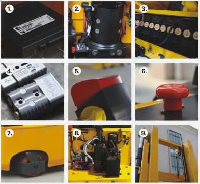 1.美国CURTIS控制器 2.WINNER液压泵站 3.240Ah大容量蓄电池 4.德国REMA充电插件 5.紧急反向行驶功能,按下此按钮,车子可反向行驶 6.紧急情况下可按下红色断电开关,切断所有电源,车子立即停止 7.平衡轮带护罩,保证操作者安全 8.超大维护保养空间,打开后罩后内部部件一览无余 1.CURTIS controller from America 2.WINNER pump station from Taiwan 3.240Ah large capacity battery 4.REMA plug from Germany 5.Reverse button, press this button, the truck will travel in reverse 6.Press the red button in an emergency, cut down all the power, stop the truck 7.Balance wheel with cover, protect the operator 8Large maintenance room |
