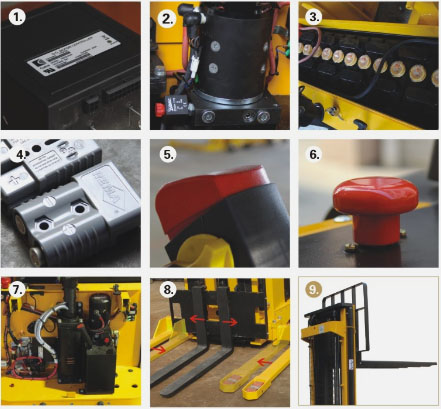 1.美国CURTIS控制器 2.WINNER液压泵站 3.240Ah大容量蓄电池 4.德国REMA充电插件 5.紧急反向行驶功能,按下此按钮,车子可反向行驶 6.紧急情况下可按下红色断电开关,切断所有电源,车子立即停止 7.超大维护保养空间,打开后罩后内部部件一览无余 8.货叉和支腿宽度可调 1.CURTIS controller from America 2.WINNER pump station from Taiwan 3.240Ah large capacity battery 4.REMA plug from Germany 5.Reverse button, press this button, the truck will travel in reverse 6.Press the red button in an emergency, cut down all the power, stop the truck 7.Large maintenance room 8.Adjustable width of legs and forks With free lifting height, when forks raising, mst is still |