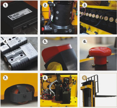 1.美国CURTIS控制器 2.WINNER液压泵站 3.240Ah大容量蓄电池 4.德国REMA充电插件 5.紧急反向行驶功能,按下此按钮,车子可反向行驶 6.紧急情况下可按下红色断电开关,切断所有电源,车子立即停止 7.平衡轮带护罩,保证操作者安全 8.超大维护保养空间,打开后罩后内部部件一览无余 1.CURTIS controller from America 2.WINNER pump station from Taiwan 3.240Ah large capacity battery 4.REMA plug from Germany 5.Reverse button, press this button, the truck will travel in reverse 6.Press the red button in an emergency, cut down all the power, stop the truck 7.Balance wheel with cover, protect the operator 8.Large maintenance room |