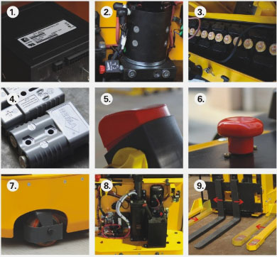 1.美国CURTIS控制器 2.WINNER液压泵站 3.240Ah大容量蓄电池 4.德国REMA充电插件 5.紧急反向行驶功能,按下此按钮,车子可反向行驶 6.紧急情况下可按下红色断电开关,切断所有电源,车子立即停止 7.平衡轮带护罩,保证操作者安全 8.超大维护保养空间,打开后罩后内部部件一览无余 1.CURTIS controller from America 2.WINNER pump station from Taiwan 3.240Ah large capacity battery 4.REMA plug from Germany 5.Reverse button, press this button, the truck will travel in reverse 6.Press the red button in an emergency, cut down all the power, stop the truck 7.Balance wheel with cover, protect the operator 8.Large maintenance room |