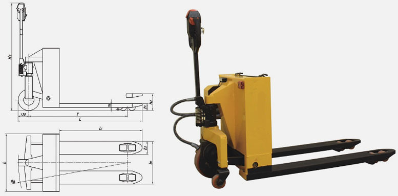 主要特点 1. 手压起升,电动行走 2. 高强度车身设计,适合高强度工作场所,使用寿命长 3. 制动可靠安全,操作灵活,起步平稳 4. 二档电压调速,可选配无极调速